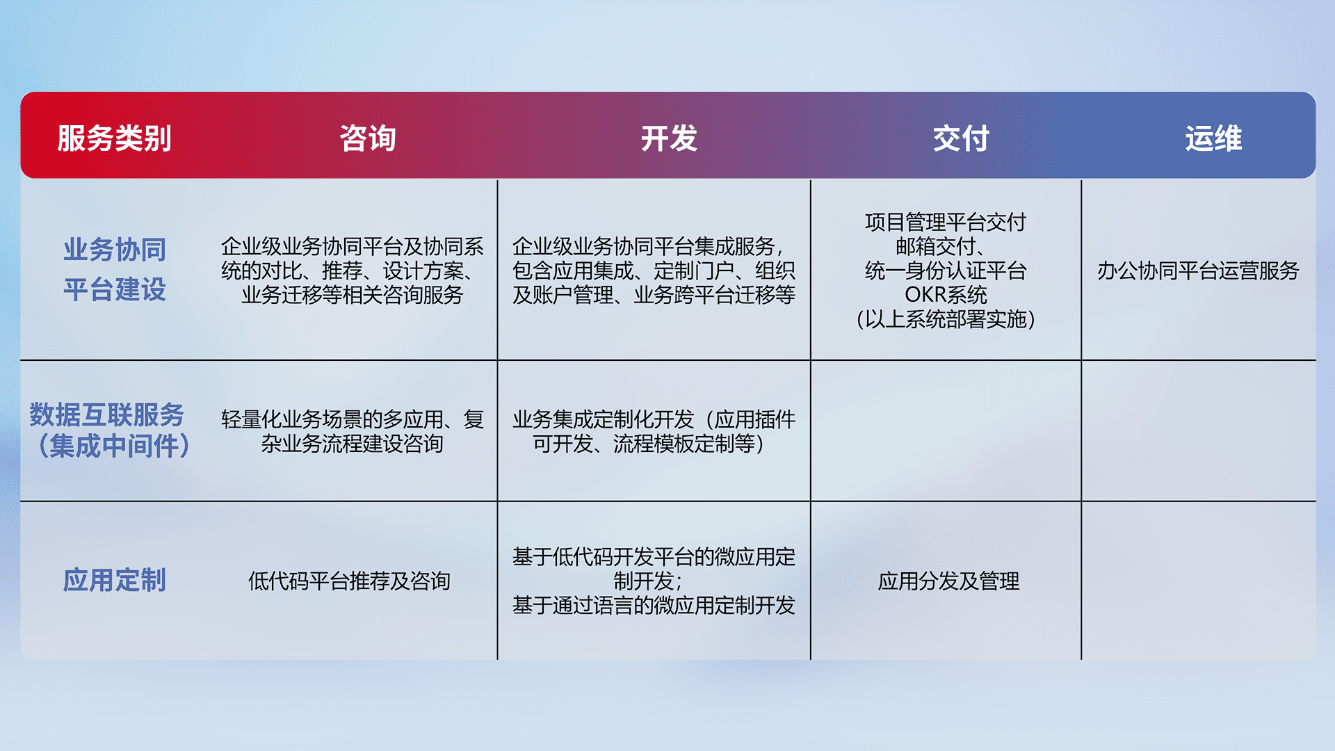 针对钉钉、、、、企微、、、IDaas等平台级产品提供产品的规划、、方案、、、交付、、、定制化开发等服务,,,,实现如统一协同办公、、、、智能客户服务、、混合会议管理、、、、智能数据查询、、、、等业务场景,,实现数字化转型。。。